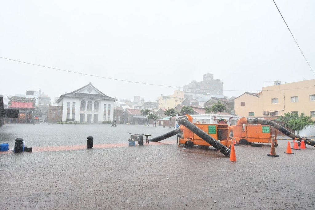 彰化縣昨天上午持續下強降雨,適逢大潮,鹿港老街、鹿港天后宮、鹿港公會堂等一帶淹水嚴重;有民眾拍下一男子裸著上半身,在鹿港公會堂前廣場游泳,一旁還有人穿雨衣站在水中擰衣服。