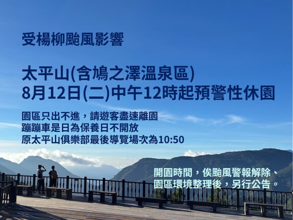 林業及自然保育署宜蘭分署今天表示,考量太平山國家森林遊樂區聯外道路恐有封閉、中斷之虞,因此園區(含鳩之澤溫泉區)明天中午12時起預警性休園,原太平山俱樂部明天最後導覽場次為上午10時50分,蹦蹦車明天為保養日不開放。