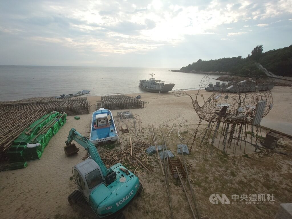 連江縣政府產業發展處長林志豐今天接受中央社記者電話訪問表示,置於「海就是我的陸」作品旁的保麗龍、竹枝等,為縣內合法養殖業者於7月起申請暫置,並承諾8月底前搭建完畢,且復原沙灘。故國際藝術島舉辦期間,應不會對作品周邊景觀造成影響。