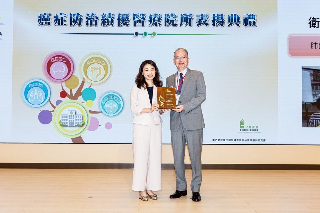 衛福部國民健康署為守護國人健康,攜手全國醫療院所推動癌症防治計畫,並鼓勵民眾積極參與癌症篩檢。今年首度辦理表揚活動,肯定在癌症防治表現優異的醫療院所。澎湖醫院脫穎而出,獲「肺篩品質王」第1名,院長匡勝捷與放射科主任蔡尹宸專程赴台接受表揚。