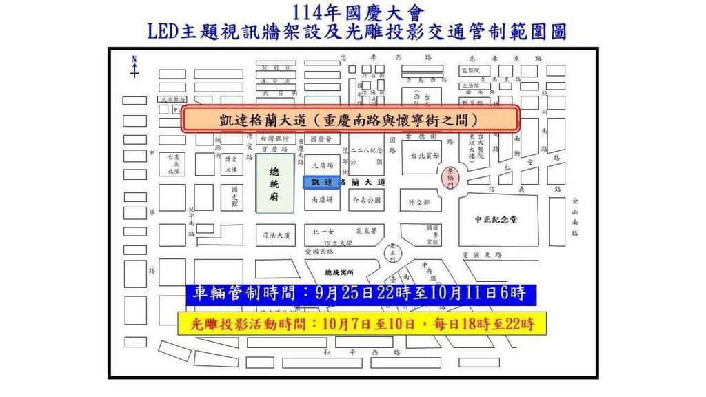其次,「LED主題視訊牆架設及光雕投影」部分,管制時間為9月25日晚間10時至10月11日清晨6時;管制範圍為凱達格蘭大道(重慶南路至懷寧街),禁止車輛通行,並視狀況彈性擴大管制範圍。