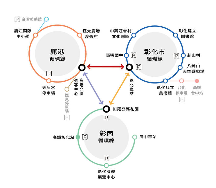 假日將加開5條路線,包括彰濱接駁線、鹿東接駁線、彰化田尾田中線、鹿港田尾田中線以及高鐵台化線。其中,彰濱接駁線、鹿東接駁線和高鐵台化線提供假日免費路外停車及高鐵台中站直達彰化展區的接駁;彰化田尾田中線與鹿港田尾田中線則串聯彰北及彰南展區,方便展區間移動。