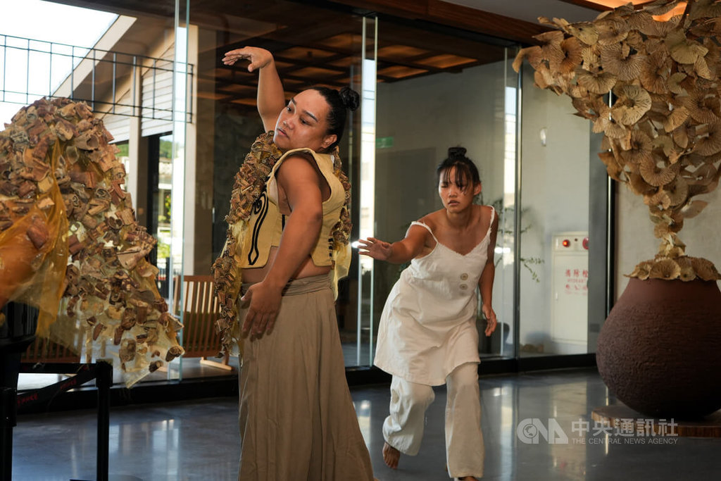 排灣族藝術家峇岦嵐偲.旮札涅蘫(左)作品「燕歸來.再歸來」以構樹樹皮敲擊製成,並結合溫泉旅館汩汩和苑空間裡原有陶甕呈現,峇岦嵐偲.旮札涅蘫4日並與舞團「羽.擊舞藝術」在作品前共舞。中央社記者黃郁菁攝 114年10月4日
