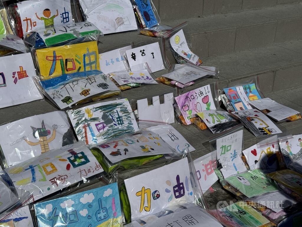 宜蘭北成國小老師說,學校跟光復的西富國小是姐妹校,學生年紀太小沒辦法參與救災,就將祝福用繪畫跟點心包成禮包,放在火車站給志工或災民領取。
