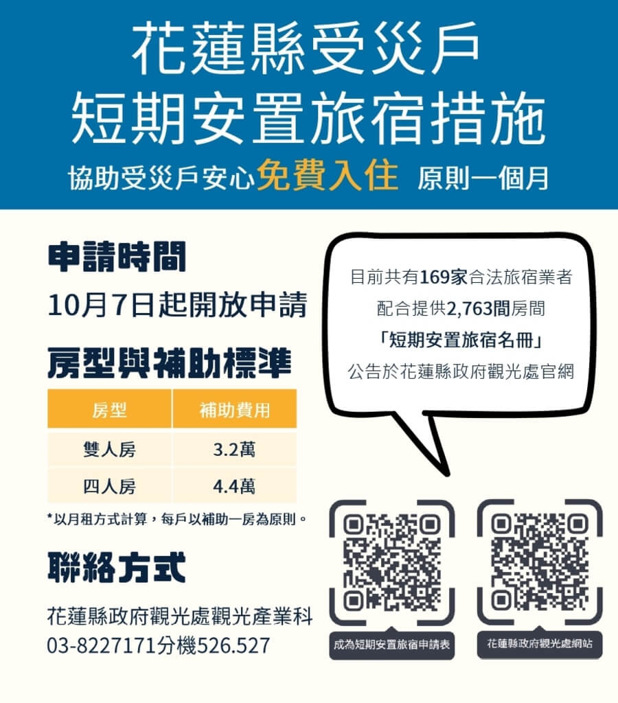 花蓮縣政府今天發布新聞稿表示,為協助「樺加沙風災」中住宅毀損且暫無合適租屋處的花蓮地區受災戶,交通部觀光署、內政部國土管理署協助安置經費來源,並由花蓮縣政府執行,共同推出「花蓮縣受災戶短期安置旅宿措施」。