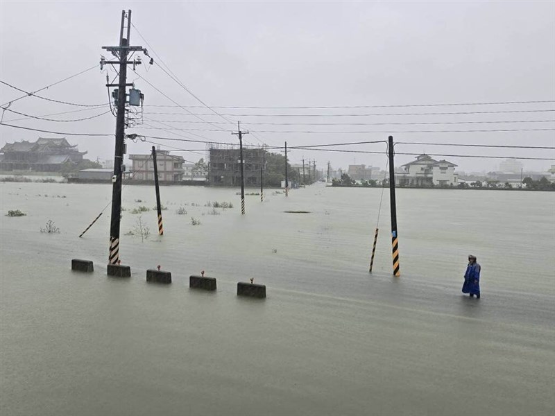 (中央社記者沈如峰宜蘭縣11日電)宜蘭縣冬山鄉今天因颱風鳳凰外圍環流影響,雨勢不斷,多處低窪區排水不及淹水,最深處至少60公分,分不清到底是農田還是道路,宛如水鄉澤國。