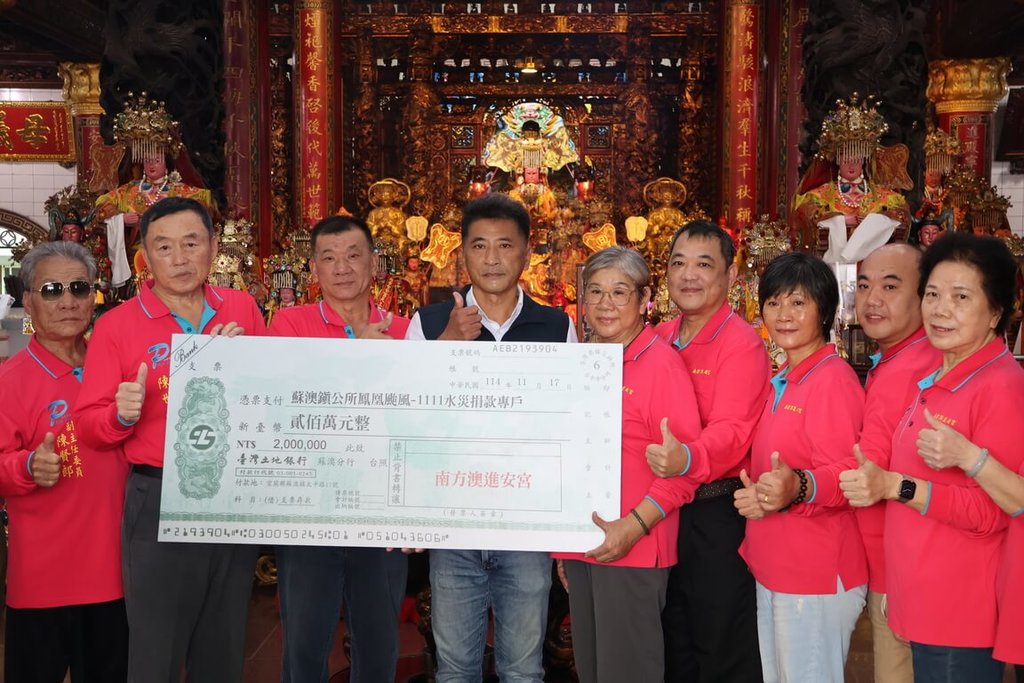 (中央社記者王朝鈺宜蘭17日電)颱風鳳凰11日帶來豐沛雨水,使得宜蘭縣蘇澳鎮成水鄉澤國,南方澳進安宮委員會今天捐助鎮公所新台幣200萬元,盼拋磚引玉,促成更多善心匯聚。