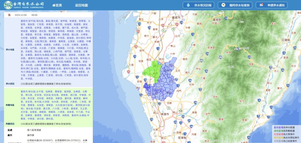 自來水公司指出,其中左鎮、大內、山上為全區停水,安定為全區水壓降低,其餘受影響行政區為部分里別停水、部分里別水壓降低,呼籲受影響用戶提前儲水備用,停水期間應關閉電動抽水機電源,慎防火警。(編輯:李亨山)1141124