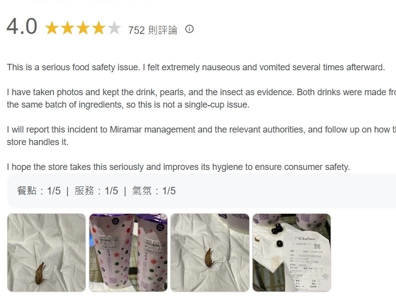 珍奶吸管內有蟑螂 日出茶太:全台同步停業1天清消