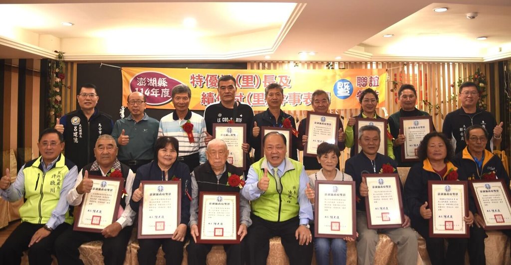 今天接受表揚的特優村里長有馬公東文里李美珠、光明里陳黃淑媛、重慶里葉建祿、桶盤里蘇德成、菜園里黃文隆、湖西鄉尖山村王家興、中西村郭宜媚、青螺村李玉立、白沙鄉後寮村葉文泉、通梁村張健完、西嶼鄉小門村章娥、二崁村陳昭回、望安鄉東坪村呂東昇、七美鄉南港村夏臨福;績優村里幹事有馬公高玉貞、陳雅婷、莊美琴、湖西鄉呂嘉惠、許春端、王明照、白沙鄉鄭玉蘭、西嶼鄉林貴英、望安鄉戚美琴等人。(編輯:黃世雅)1141212