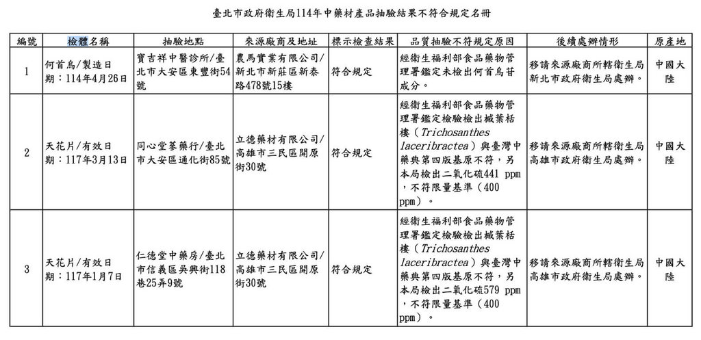 衛生局說,品質檢驗結果有3件不符合規定,包含1件何首烏及2件天花片,不符合衛生福利部食品藥物管理署鑑定檢驗指標成份及基原的規定;續驗天花片二氧化硫含量,檢出441ppm及579ppm,不符限量基準400 ppm,而這件何首烏來源廠在新北市、2件天花片來源廠在高雄市,已移請所轄衛生主管機關依法核處。