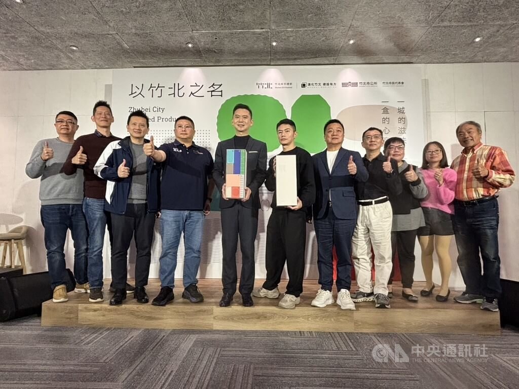 鄭朝方致詞表示,今年伴手禮以垂直型且撞色的「超越禮盒」呈現,象徵竹北的高樓與多元、包容,集結農產、食品、生活用品等,盼透過設計放大品牌識別,而禮盒內有黑豆麵、川味香麻醬、原味堅果、香皂等。