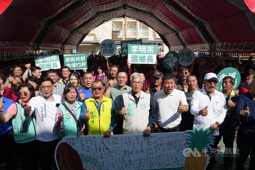民進黨籍李明宗今天在內埔鄉東片村活動中心召開記者會,正式宣布投入內埔鄉長選戰,請辭自明日起生效。同黨籍現任內埔鄉長鍾慶鎮已2任屆滿,今天率7名鄉代及17名村長站台力挺。