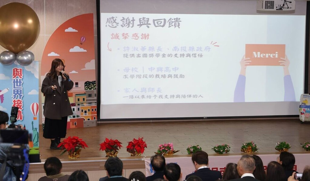 縣府今天在縣立旭光高中舉辦出國學習獎助學金成果發表會,許淑華、南投縣政府教育處長王淑玲等人出席,見證南投學子在國際舞台豐碩成果;許淑華表示,面對全球化挑戰,國際教育已非「加分項」而是「基本能力」,縣府將持續作為學生堅強後盾。
