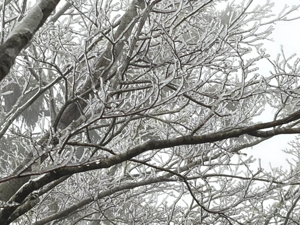 (中央社記者王朝鈺宜蘭8日電)受寒流影響,宜蘭太平山翠峰湖一帶陸續出現冰霰,林木枝條可見霧淞,吸引不少遊客駐足觀賞,有遊客說,第1次在台灣看見冰霰、霧淞相當興奮。