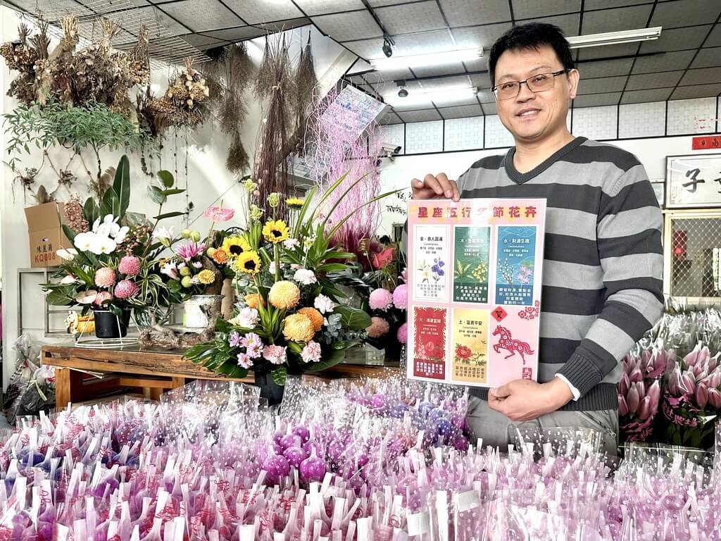 羅國誌表示,許多民眾為增添喜氣及年味,會買花在家中擺設,正是推廣花卉好時機,他特別製作解說牌,讓消費者清楚含義,方便挑選應景花卉,如百合、桔梗等有百年好合、智慧等意涵,萬年青有步步高升之意。