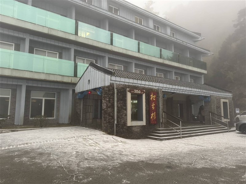 合歡山當地工作人員表示,清晨5時許及上午7時許分別降冰霰,松雪樓周邊地面與停車場車輛如鋪上白色糖霜,遊客開心拿出手機,拍下美麗銀白畫面。