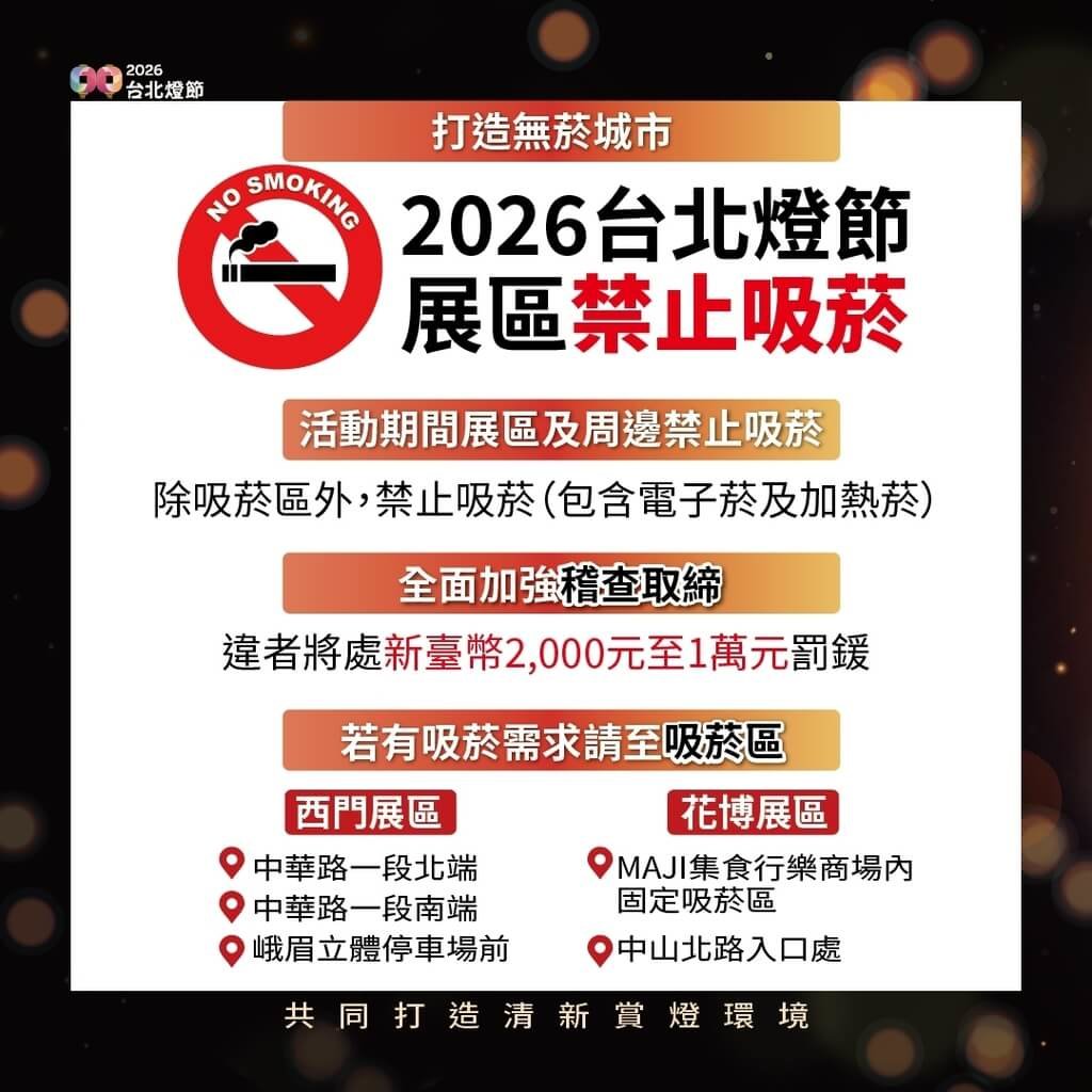 北市為推動無菸城市,觀傳局提醒,於花博、西門展區自2月25日到3月15日登場的「2026台北燈節」,期間跟展區周邊也是禁菸,此菸包含電子菸、加熱菸。