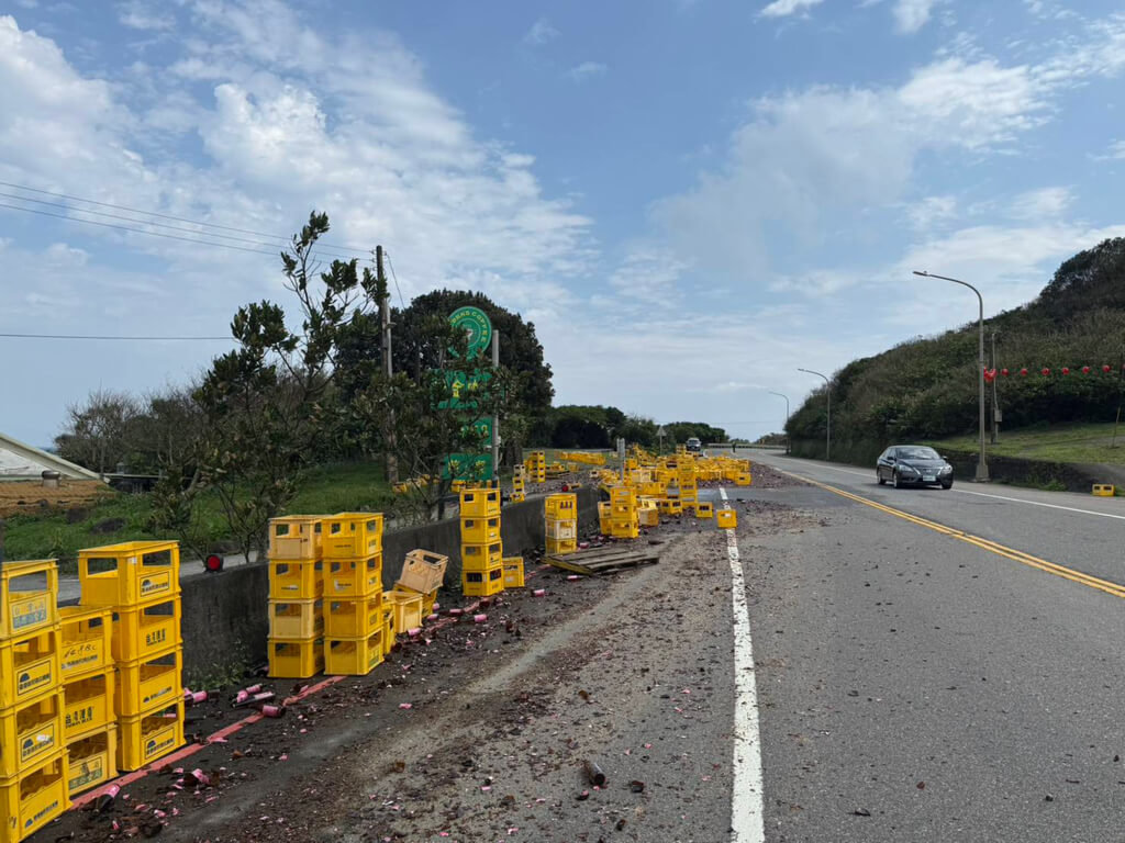 警方上午11時40分獲報,新北市瑞芳區台2線91.4公里處往基隆方向,有大量裝箱米酒散落在路面,員警到場對駕駛林男實施酒測,沒有酒精反應,經毒品快篩,也沒有毒駕情形。