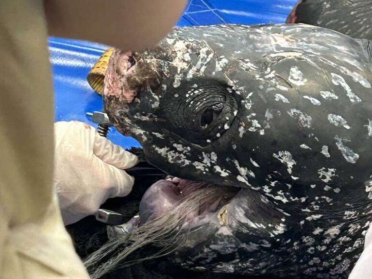 海保署說明,獸醫團隊於今天完成解剖釐清死因,初步發現革龜從食道至胃,約180公分長的消化道內皆有網具,取出整條長約9公尺漁網,胃黏膜有部分壞死,不排除有消化道阻塞問題,另腎臟有明顯病變,詳細死因待病理報告確認。