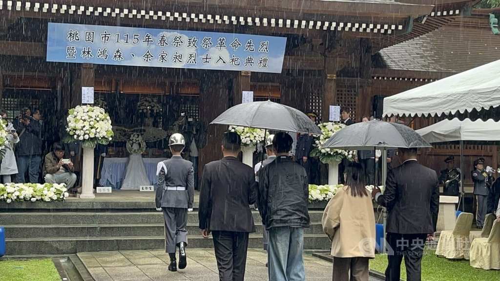 桃園市政府今天在忠烈祠舉行「桃園市115年春祭致祭革命先烈暨林鴻森、余家昶烈士入祀典禮」,由桃園市長張善政擔任主祭官,典禮依序舉行奏樂、獻花、讀祭文及鞠躬禮等儀式,現場下雨,場面莊嚴肅穆。