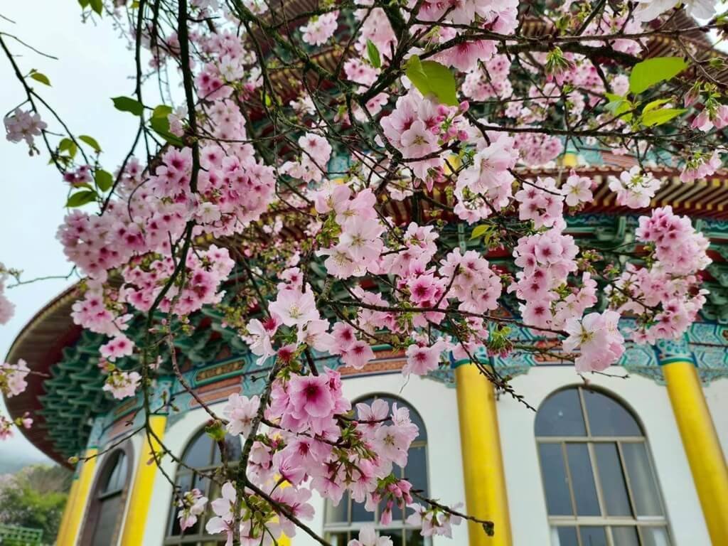 景觀處表示,賞櫻景點絕不能錯過最知名的天元宮,層層綻放的吉野櫻,圍繞著5層圓形「無極真元天壇」建築,搭配遠山景色,構成春季限定的經典畫面,是攝影愛好者與賞花民眾朝聖熱點,微風吹拂時花瓣輕舞,更為畫面增添夢幻氛圍。