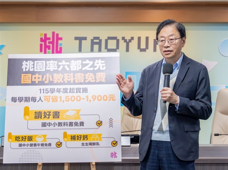 張善政今天在市政會議宣布,自115學年度起全面實施國中小學生教科書免費政策,是繼「國中小免費營養午餐」、「生生喝鮮乳」後推出的教育第三部曲,象徵桃園正式進入「義務教育真正免費」的新里程碑,全面消除義務教育中的隱藏成本,落實「吃好飯、補好鈣、讀好書」的施政願景。
