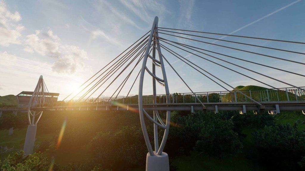 報告提到,此座人行跨越橋將採雙葉造型的斜張橋,興建完成後將可串聯貓空纜車站與茶推廣中心附近景點,營造人車分道、行人友善步行動線,未來將納入「三貓計畫2.0」特色景點,推動地方觀光行銷,估民國116年2月開工、118年竣工啟用。