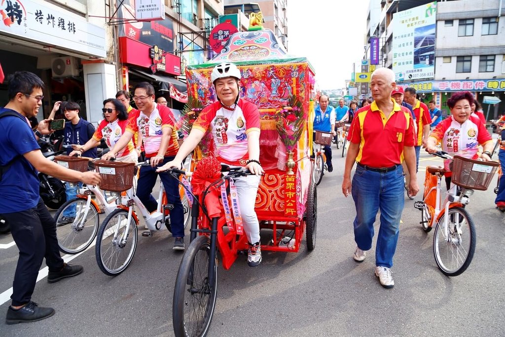 市公所今天在公所廣場辦記者會,苗栗縣副縣長邱俐俐、苗栗市長余文忠、苗栗市民代表會主席陳仁杰、苗栗市天后宮主任委員林岳爐與北港朝天宮副董事長蘇健榮等人為媽祖鑾駕揭幕,並領騎繞行苗栗市府前路等路段,為活動暖身。