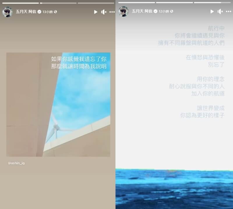阿信則在臉書限時動態發文表示,「如果你感覺我遺忘了你,那麼就讓時間為我說明」、「航行中,你將會繼續遇見與你擁有不同羅盤與航道的人們,在憤怒與恐懼後,別忘了用你的理念,耐心說服與你不同的人,加入你的航道,讓世界變成你認為更好的樣子」等文。(編輯:李亨山)1130711