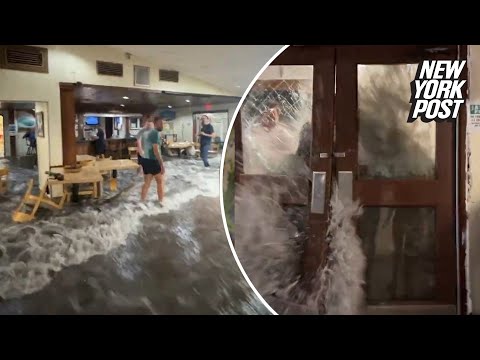 美軍駐防地內部影片畫面顯示,洶湧的海浪將人沖倒、撞開玻璃門並打碎窗戶。