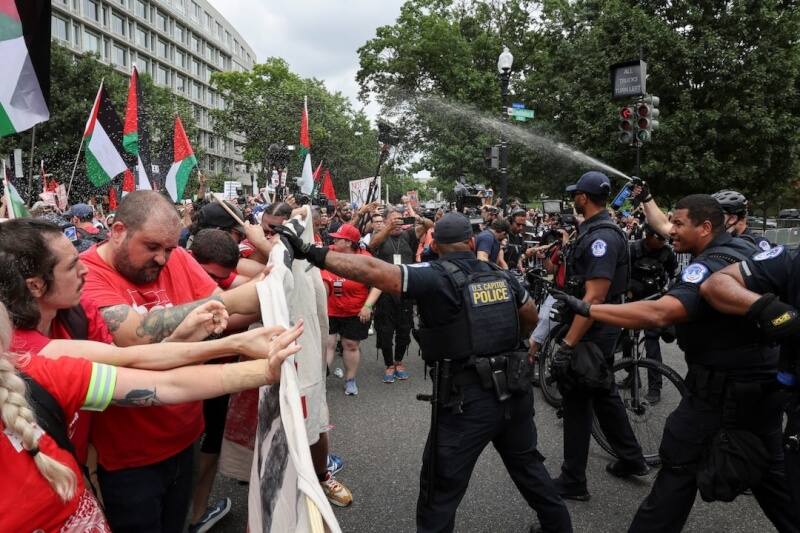 示威者在附近放置近30個真人大小的硬紙板製棺材,上面裹著巴勒斯坦國旗,以紀念加薩戰爭遇害者。美國國會山莊附近有數條道路無法通行。