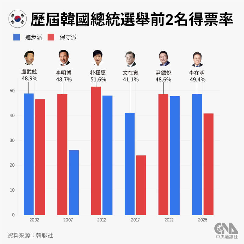(中央社記者廖禹揚首爾4日專電)韓國第21屆總統大選落幕,共同民主黨候選人李在明以49.42%的得票率勝出,並於當地時間今天上午6時21分開始任期,11時(台灣時間10時)在國會廣場舉行就職典禮。