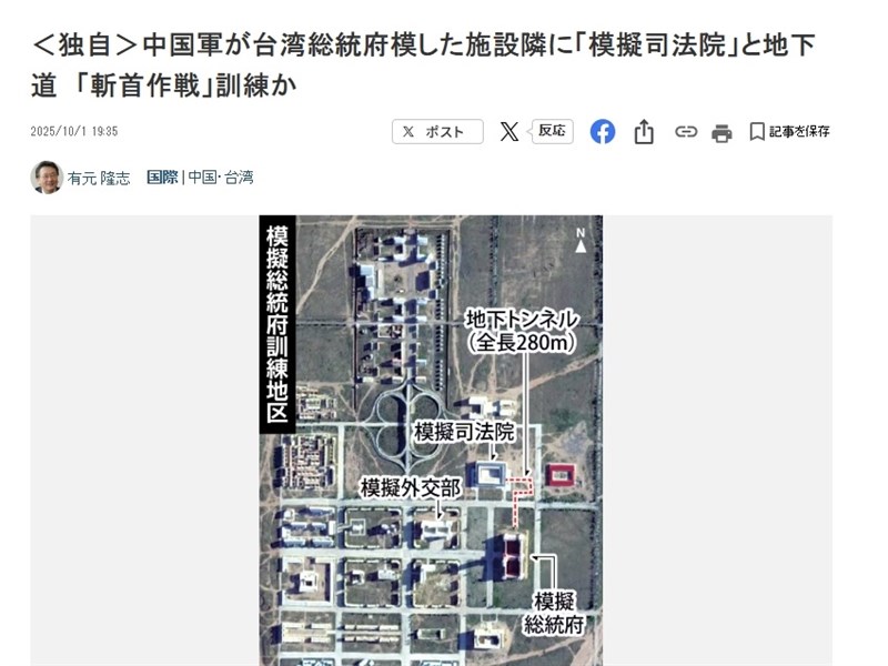 (中央社記者楊明珠東京2日專電)日本智庫「國家基本問題研究所」取得衛星圖像顯示,共軍為了準備侵略台灣,在內蒙古自治區內的訓練場所設的「模擬總統府」一旁新建「模擬司法院」,並以地道連結的工程已完工,藉此強化對台灣總統的「斬首作戰」。
