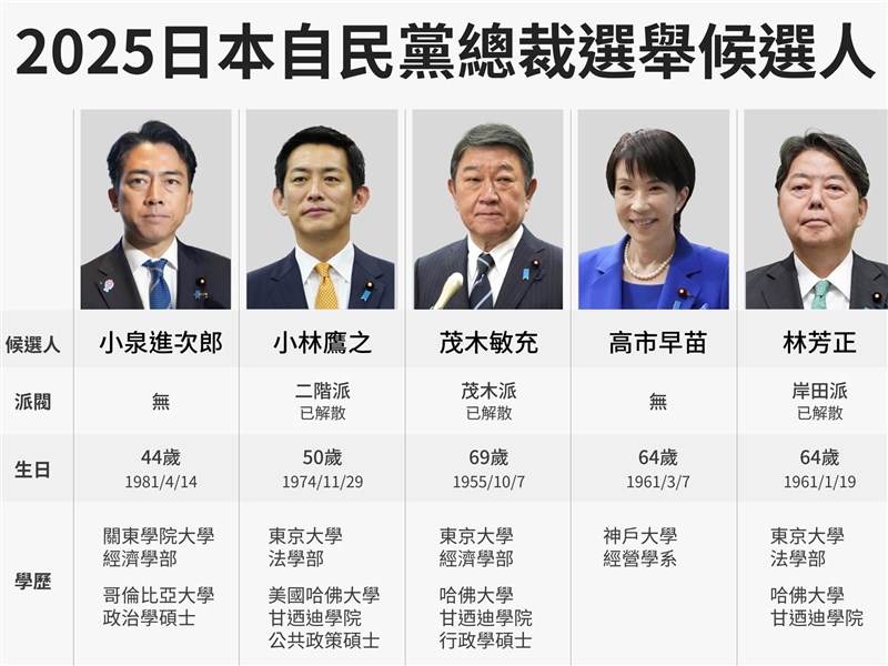 這5名候選人分別為前經濟安全保障大臣小林鷹之、自民黨前幹事長茂木敏充、內閣官房長官林芳正、前經濟安全保障大臣高市早苗,以及農林水產大臣小泉進次郎。