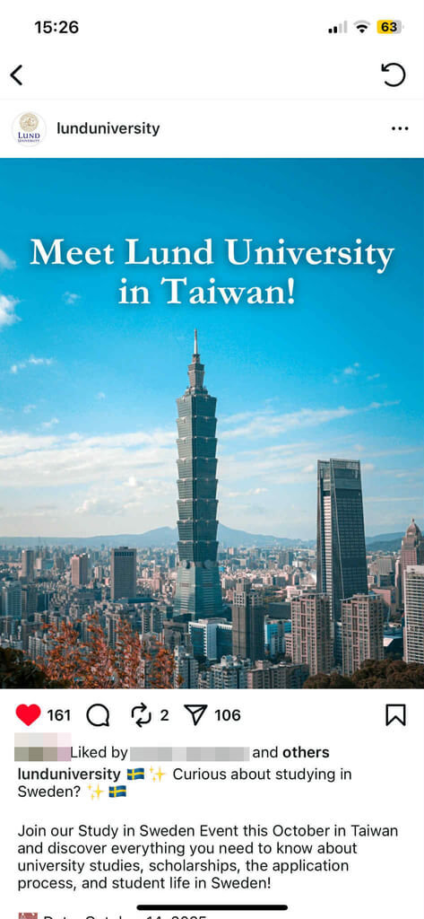 隆德大學(Lund University)9月29日於Instagram的官方帳號上發布貼文,宣傳10月14日在台灣舉辦的留學說明會,宣傳的圖文中原本寫著 Meet Lund University in Taiwan ,但在隆德大學讀書的台灣留學生卻在幾個小時後發現,隆德大學撤除原本貼文,並發布寫著 Meet Lund University in Taipei 的新貼文。