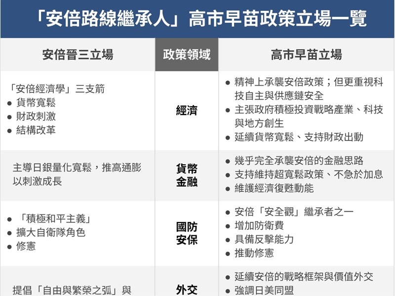 在國防與安全保障方面,安倍晉三強調「積極和平主義」、擴大自衛隊角色。高市在國防與安全保障上也反映出安倍遺緒,像是她力推改自衛隊為「國防軍」、支持修改憲法第9條「放棄戰爭」條款,並增加國防預算。
