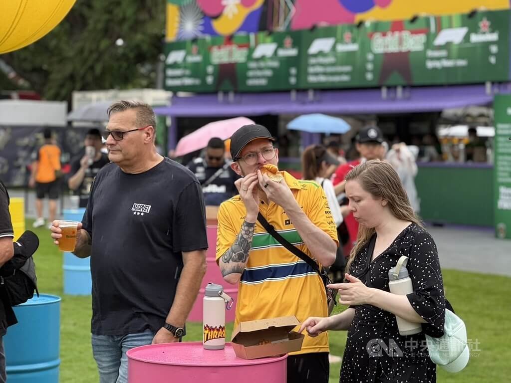 F1新加坡大獎賽3日至5日登場,賽事精彩之餘,演出陣容同樣造成轟動。圖為粉絲在現場大啖美食。中央社記者吳昇鴻新加坡攝 114年10月5日