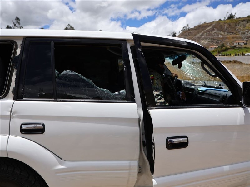 厄瓜多總統府稍早發布一段車內拍攝影片,畫面可見抗議民眾在路邊投擲石頭,總統座車車窗出現裂痕;另一張官方發布的照片也顯示,車窗和擋風玻璃破裂。