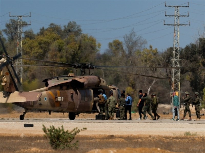 圖為一架以色列黑鷹直升機停在以色列雷姆軍事基地,人質獲釋後預計會抵達此處。(路透社)