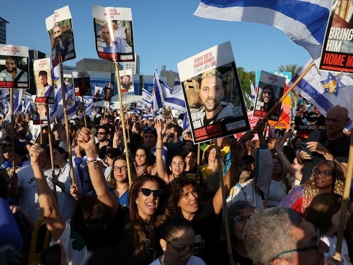 數百人聚集在特拉維夫的人質廣場(Hostages Square),他們歡呼雀躍,揮舞著以色列國旗,並高舉著人質的海報。(編譯:陳昱婷)1141013