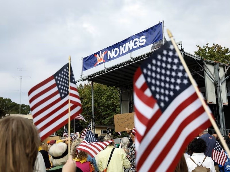 在俄勒岡州波特蘭(Portland)的河畔地區,70歲的退伍軍人布瑞斯(Kevin Brice)與數千名抗議者一同湧入集會現場,他穿著一件印有「自1776年起,我們沒有國王」(No Kings since 1776)標語的黑色運動衫。