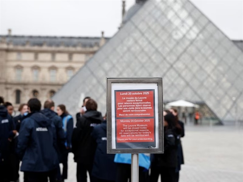 羅浮宮發生重大竊案後,20日廣場上放置「因特殊原因關閉」告示牌。(路透社)