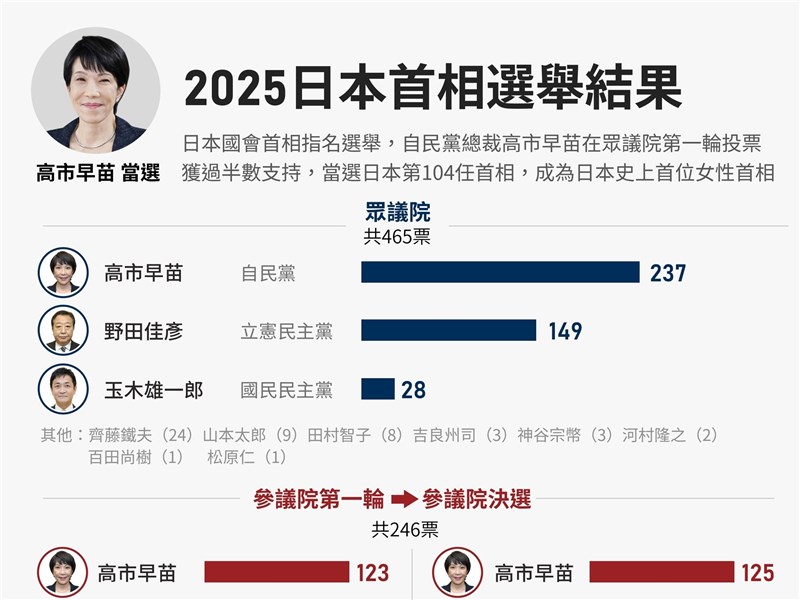日本放送協會(NHK)報導,日本眾議院與參議院今天分別舉行首相指名選舉,高市在眾院第一輪投票獲得237票,超越過半門檻233票,被指名為首相。而其他人的票數皆未過半,最大在野黨立憲民主黨代表野田佳彥149票、國民民主黨代表玉木雄一郎28票、公明黨代表齊藤鐵夫24票等。