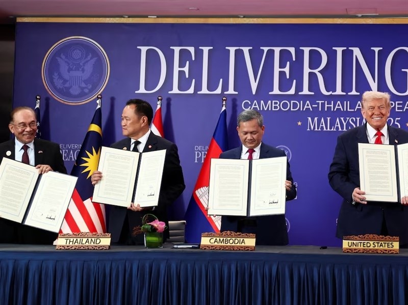 法新社報導,在川普(Donald Trump)和馬來西亞首相安華(Anwar Ibrahim)共同見證下,泰國總理阿努廷(Anutin Charnvirakul)和柬埔寨總理洪馬內(Hun Manet)簽署這項協議,對兩國邊境今年發生的流血衝突做出回應。