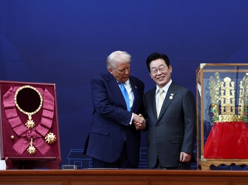 川普今天抵達峰會現場時,獲得李在明頒授韓國最高級別勳章無窮花大勳章,創美國總統先例。李在明並贈送川普韓國新羅王朝文物天馬塚金冠模型,慶州是新羅王朝古都。
