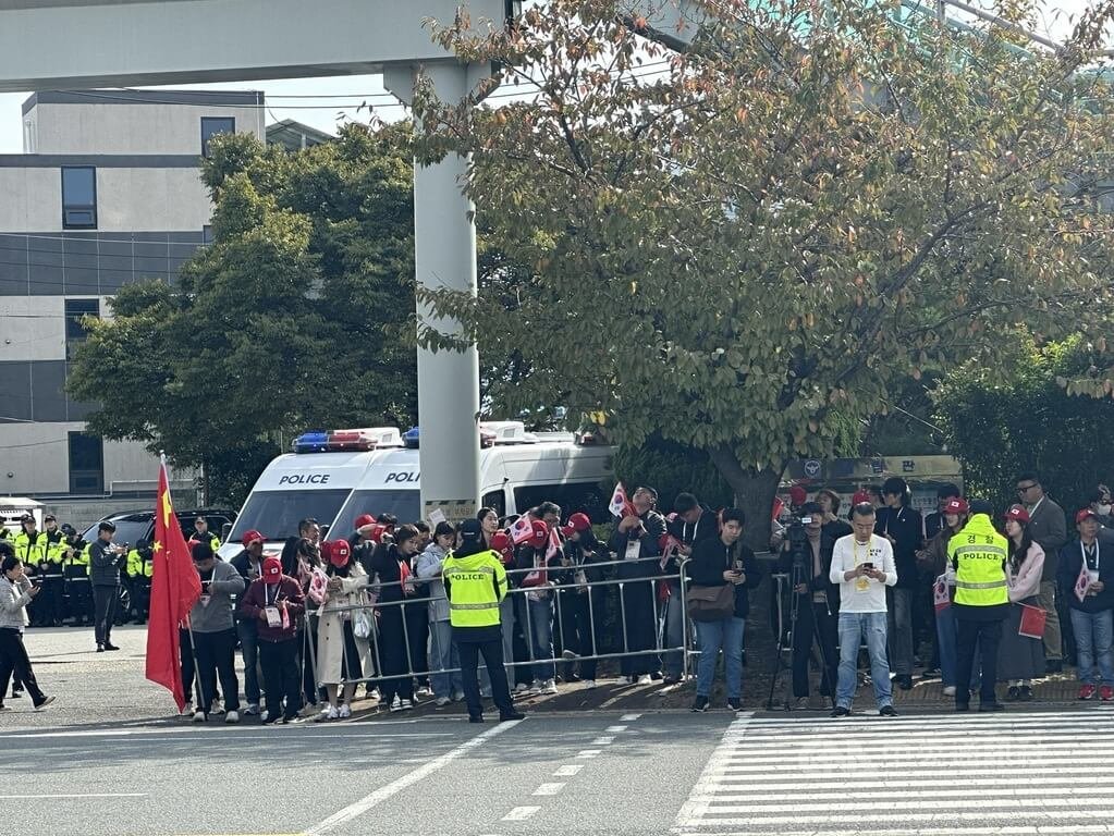 管制區域前嚴陣以待的除了媒體與維安員警外,還有一台台遊覽車載來的中國學生及民眾,他們個個手持中韓國旗,在鄰近管制區域的大路兩旁排排站,不時演練著歡迎習近平訪韓的口號。