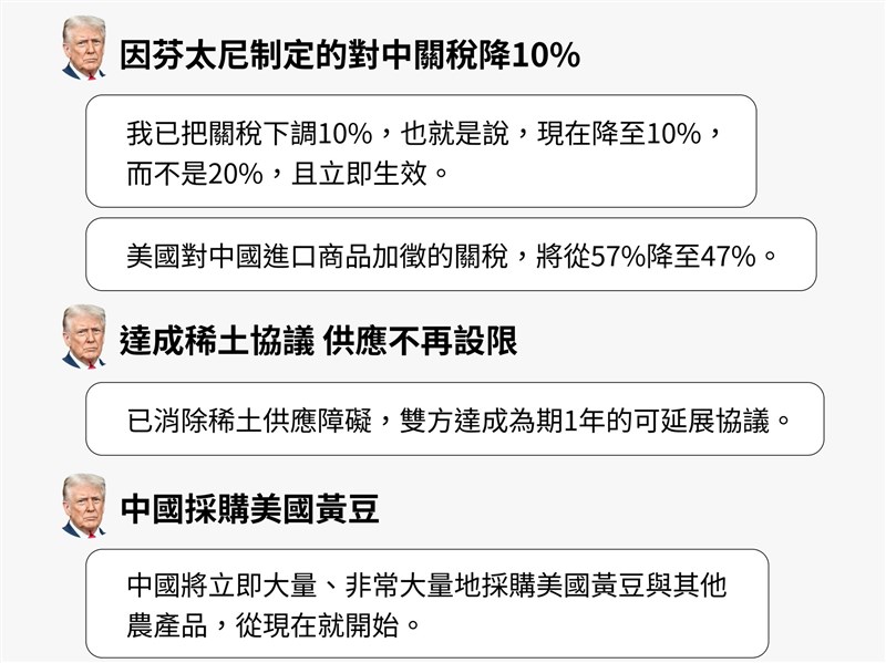美國農業部長羅林斯(BrookeRollins)表示,中方也會撤銷對美國農產品的報復性關稅。中國商務部發言人則表示,中國將「相應調整」反制措施,但未提供細節。