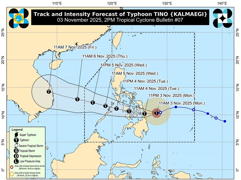 目前中部多個省分及島嶼已發布3號颱風警報,意味著未來18小時內的風速將介於每小時89至117公里;穿越中部期間,風速可能增強至每小時118至184公里,觸發4號颱風警報。
