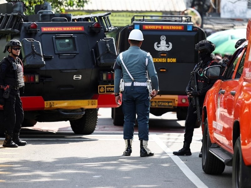 印尼「羅盤電視台」(Kompas TV)與「都會電視台」(Metro TV)播放的畫面顯示,警方在學校周圍拉起封鎖線,現場停有多輛救護車。(編譯:陳正健)1141107